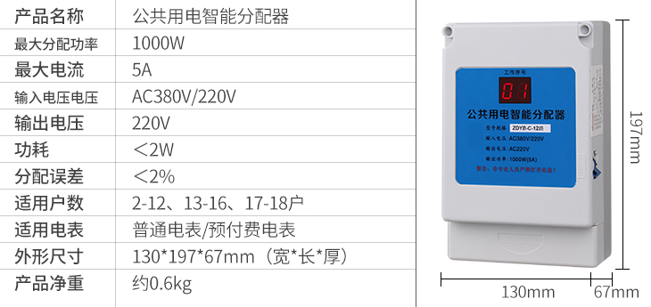 一、智盛牌公用電智能分配器”是將公共樓道用電所消耗的電能(如樓道燈,對(duì)講防盜門等),自動(dòng)分配到各受益用戶的電表中。每天輪流接通一戶電表,開機(jī)通電時(shí)第一戶電表隨機(jī)產(chǎn)生,達(dá)到公平分?jǐn)傠娰M(fèi)的目的,本款公共用電智能分配器特點(diǎn):內(nèi)置小型空開,過載短路直接切斷,避免頻繁更換保險(xiǎn)絲。